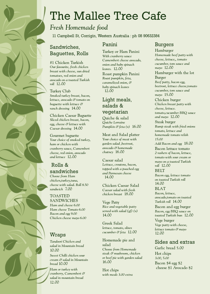 Welcome to The Mallee Tree Cafe, a delightful gem nestled in the heart of Corrigin, WA. This charming cafe offers a diverse and tantalizing menu perfect for any craving. Visitors can indulge in a variety of paninis, from the savory Turkey or Ham Panini to the flavorful Roast Pumpkin Panini, each served on toasted sesame seed buns that enhance the experience.
